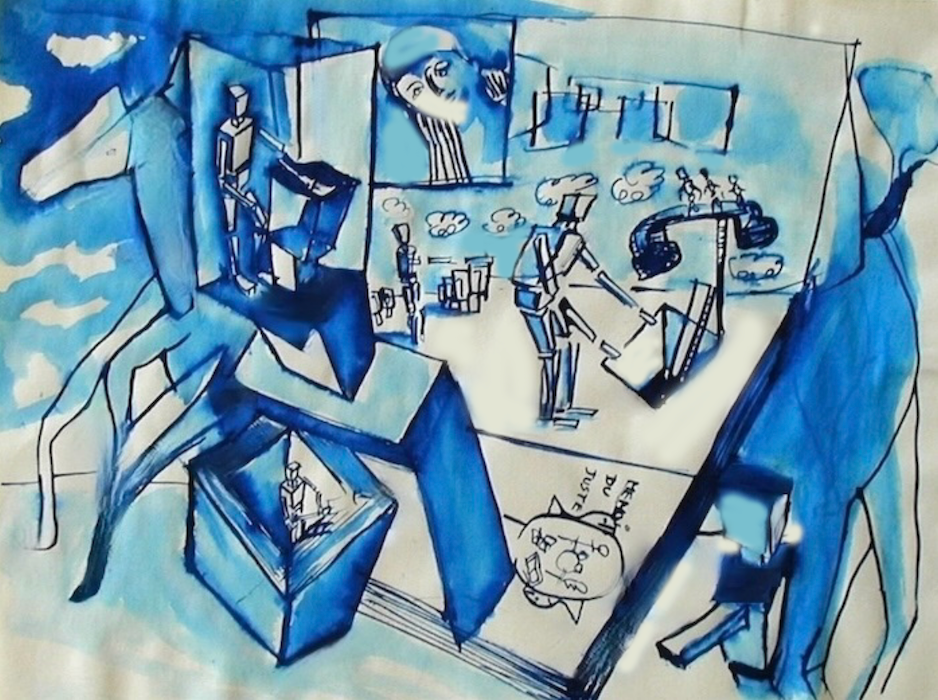 Grégoire rêve de cette page bleu d'artiste, voulant représenter les processus psychologiques communs à tous, tout en prenant en compte les lois de la perspective.