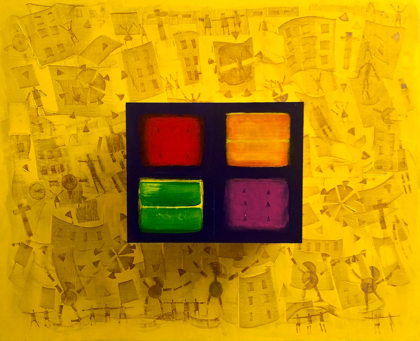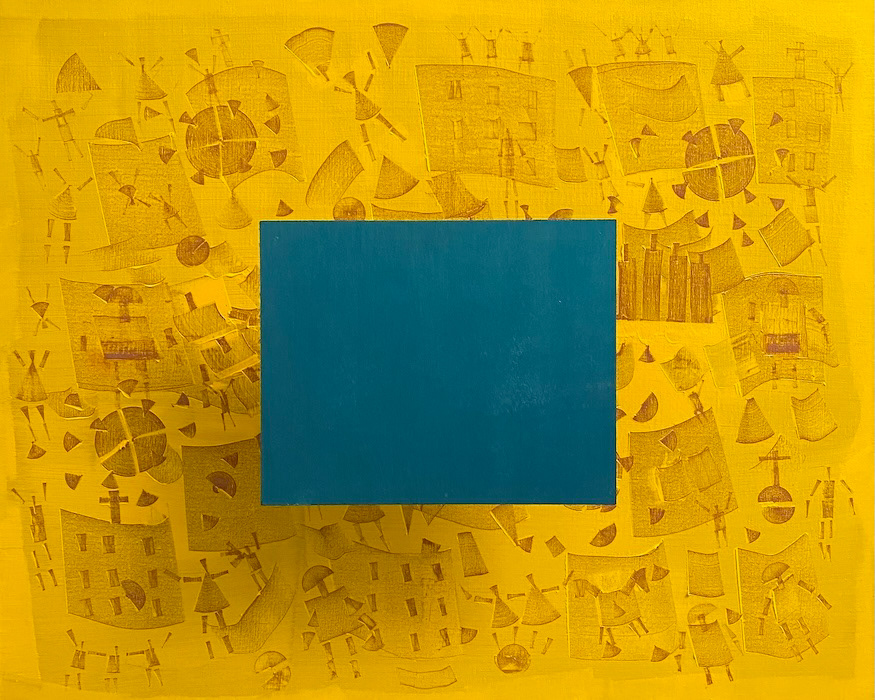 " L' échelle dans une maison bleue " - Technique mixte sur toile et bois - 73 x 60 x10 cm - 2024